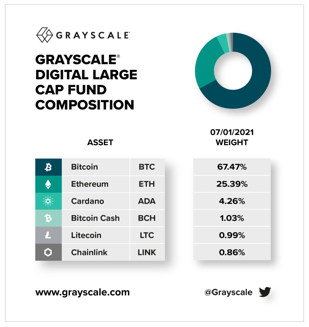 Grayscale have just announced that they have adjusted the portfolio of Grayscale Digital Large Cap Fund by selling certain amounts of the existing Fund components in proportion to their respective weightings and using the cash proceeds to purchase ADA. The table above shows the weightings as of July 2, 2021. The Digital Large Cap Fund…